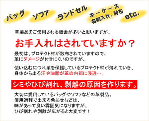 例) ソファ、革衣料、ハンドバック、ランドセル、革製家具など 対応できない製品 ヌバック、ベロア、スウェードなど起毛された革製品 ご使用の前に 見えにくい場所などでお試しの上ご使用下さいませ。