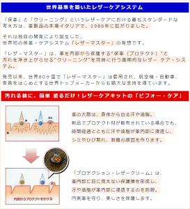 「レザーマスター」は、革を内部から保護する“保革(プロテクト)”と汚れを浮き上がらせる“クリーニング”を同時に行う画期的なレザー ケア・システム。